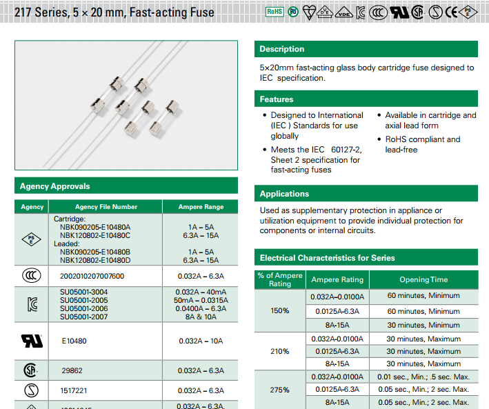 力特保險絲217 系列 - 符合IEC規范的5x20mm快熔型玻璃管保險絲:
