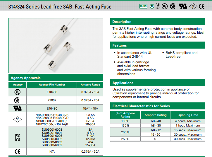 力特保險絲314 系列-3AB的功能與特色: