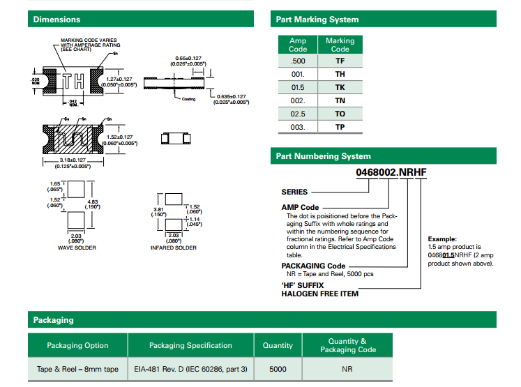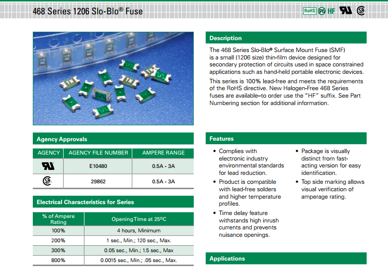 力特保險絲468系列Slo-BloB表面貼裝保險絲(SMF) 是一款小型(1206尺寸規格)薄膜裝置,用于產品空間受限應用(例如手持便攜式電子設備)中電路的次級保護。此系列100%無鉛, 符合RoHS指令的要求。
