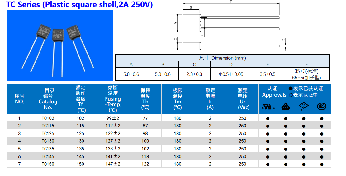 方形溫度保險絲:TC 系列 (塑膠方形,2A 250V)