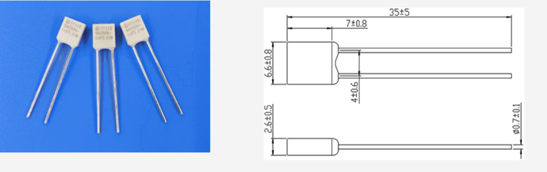 方形溫度保險絲:TT 6.6x2.6x7 5A250V
