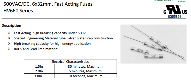 玻璃管保險絲HV660 series 500Vac/dc 10A-30A